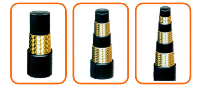 高壓鋼絲編織膠管結(jié)構(gòu)是由耐液體的合成膠管內(nèi)膠層、中膠層、Ⅰ或Ⅱ?qū)踊颌髮愉摻z編織增強(qiáng)層及耐氣候性能優(yōu)良的合成橡膠外膠層組成。