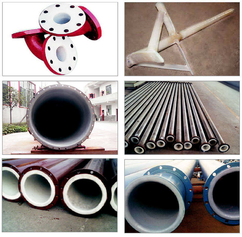 公司PE(PO)襯里采用的原材料是進(jìn)口粉末狀的線性低密度聚乙烯(LLDPE),它的加工方法為旋轉(zhuǎn)成型,工件(鋼制容器或管道)在旋轉(zhuǎn)的過程中加熱,粉狀樹脂的工作表面吸熱熔融,旋轉(zhuǎn)一次便粘上一層粉狀樹脂,隨即吸熱融化,最后加工至規(guī)格厚度后冷卻成型,所以它在工藝上保證了襯層無針孔、無泄漏、無任何焊縫。并且該工藝對(duì)工件的內(nèi)外結(jié)構(gòu)無要求,無論結(jié)構(gòu)如何復(fù)雜,均能加工成型。在工件較大,運(yùn)輸有困難的情況下還可以現(xiàn)場施工,使用溫度在100℃以內(nèi),在酸、堿、鹽等強(qiáng)腐蝕介質(zhì)中能長期穩(wěn)定使用,廣泛用于冶金、化工、制藥、食品、環(huán)保、能源等行業(yè)中接觸腐蝕介質(zhì)的管道、槽、罐、塔、風(fēng)機(jī)、交換器、攪拌槳、閥門等。